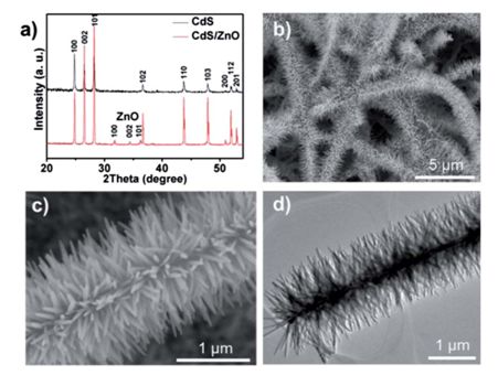 圖1:(a)CdS納米帶與CdS/ZnO樹枝狀異質(zhì)結(jié)的XRD峰對比。(b)低倍數(shù)SEM下觀測到的CdS/ZnO樹枝狀異質(zhì)結(jié)。(c)(d)分別對應SEM和TEM下觀測到的CdS/ZnO樹枝狀異質(zhì)結(jié)。