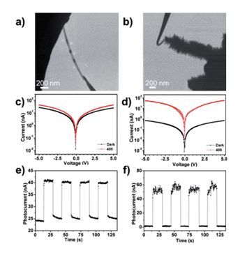 圖4:(a)(b)分別對應CdS納米帶和CdS/ZnO異質(zhì)結(jié)安置在原位光學-光纖樣品桿中的TEM圖像。(c)(d)分別對應CdS納米帶和CdS/ZnO異質(zhì)結(jié)I-V曲線的開關(guān)特性。(e)(f)分別對應CdS納米帶和CdS/ZnO異質(zhì)結(jié)對周期性光信號的響應特性。