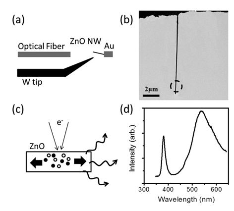 圖1:(a) 原位透射電子顯微鏡光學(xué)-光電測量系統(tǒng)應(yīng)用原理圖;(b) 單根ZnO納米線的TEM圖像,電子束被聚焦在納米線的末端。(c) 圖解ZnO納米線的發(fā)光機(jī)制; (d) 典型的CL譜。