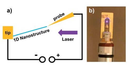圖2:(a)原位透射電子顯微鏡光學-光電測量系統(tǒng)應用示意圖。(b)原位透射電子顯微鏡光學-光電測量樣品桿頭部實拍圖。