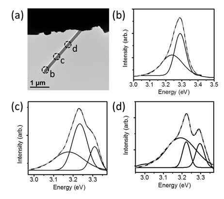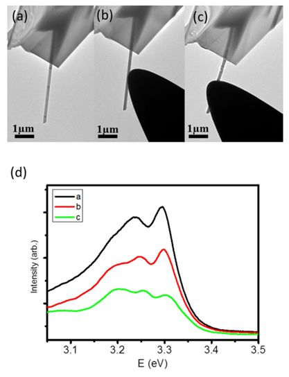 圖1:(a) 原位透射電子顯微鏡光學(xué)-光電測量系統(tǒng)應(yīng)用原理圖;(b) 單根ZnO納米線的TEM圖像,電子束被聚焦在納米線的末端。(c) 圖解ZnO納米線的發(fā)光機(jī)制; (d) 典型的CL譜。